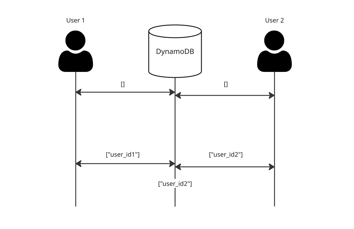 이 구현은 필연적으로 동시성 문제를 일으킨다. 비슷한 시간에 들어온 요청은 모두 빈 리스트를 조회한다. 자신의 아이디를 리스트에 추가 후 업데이트한다. 최종적으로 트랜잭션이 늦게 끝난 사용자2의 변경 사항이 데이터베이스에 남는다.
