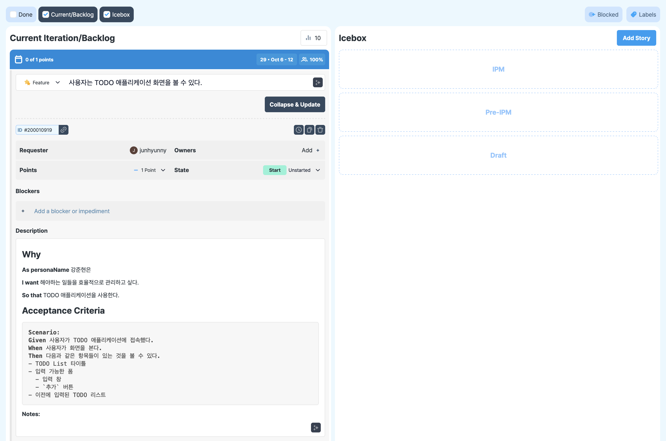 PM, 디자이너들이 작성한 스토리는 기술적 검증이나 개발에 착수할 수 있는 상태인지 등의 검토가 되지 않은 상태다. IPM(iteration planning meeting), Pre-IPM 같은 활동을 통해 스토리를 검증하고, 구현 복잡도를 고려해 스토리에 점수를 매긴다. 점수가 매겨진 사용자 스토리는 아이스 박스에서 백로그(backlog)으로 옮긴 후 개발에 착수한다.