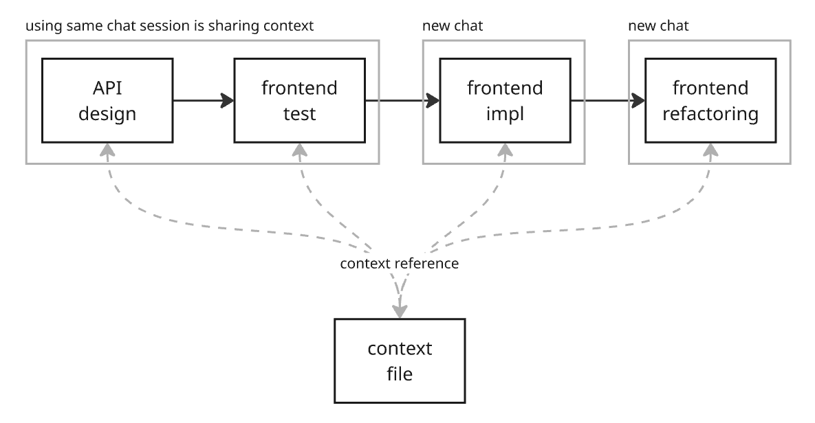 각 프롬프트가 실행될 때 이들은 서로 독립적이지 않다. 이전 프롬프트 결과물에 의존한다. 예를 들면, 프론트엔드 테스트 프롬프트는 테스트 코드를 작성한다. 프론트엔드 구현 프롬프트는 앞서 만들어진 실패하는 테스트들을 성공시키기 위한 구현 코드를 작성한다. 코파일럿(copilot)을 사용하는 경우 동일한 채팅 세션에선 이전 프롬프트에 대한 컨텍스트가 남아 있지만, 새로운 채팅 세션을 열어서 작업하는 경우 이전 작업에 대한 컨텍스트가 끊어진다. 이를 보완하기 위한 장치가 필요하다.