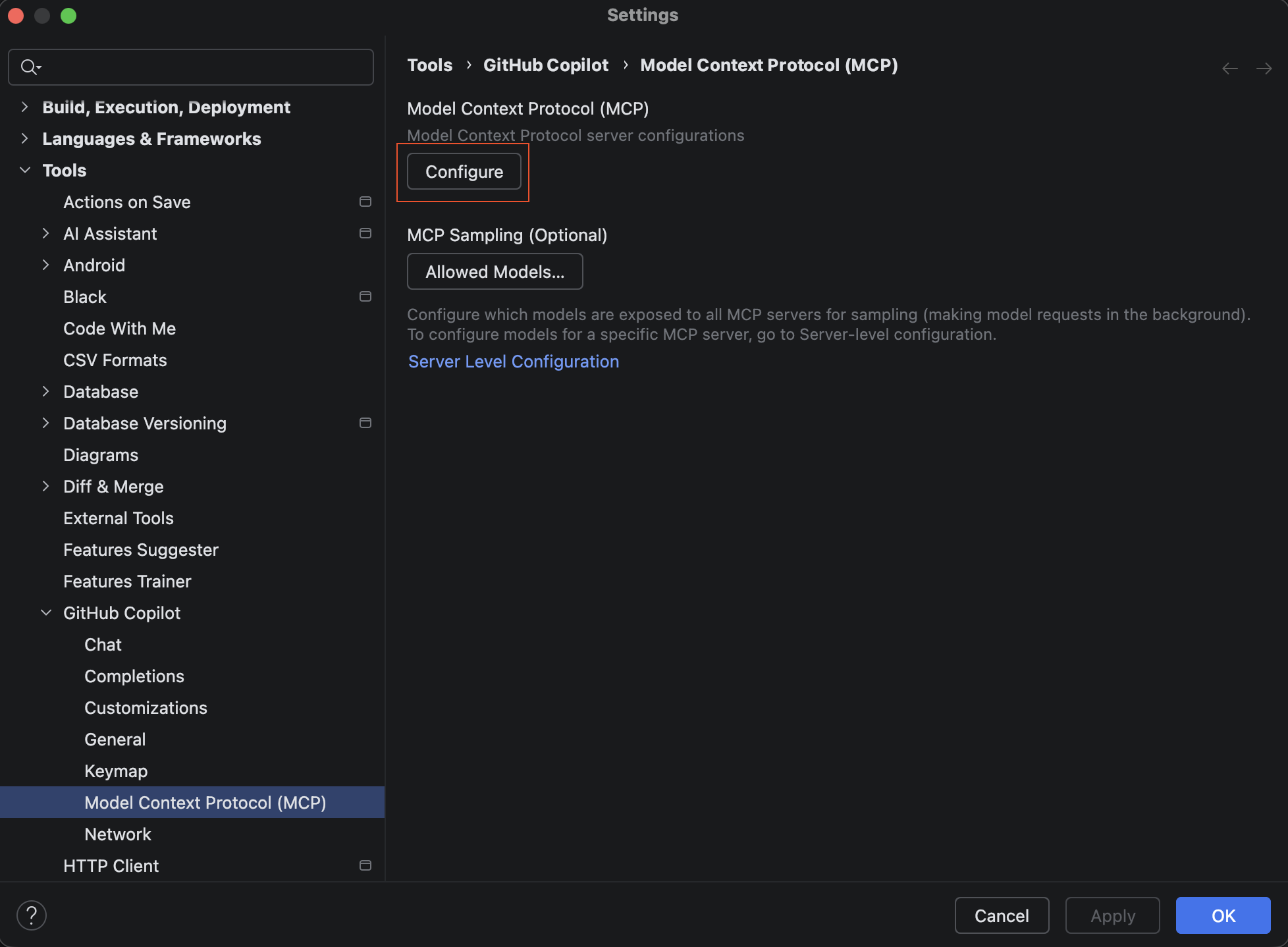 CMD + ,(comma)을 단축키로 설정 화면을 연다. - 코파일럿 MCP 설정(configure) 버튼을 누른다.