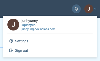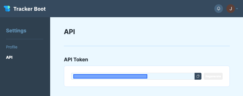 YOUR_TRACKER_BOOT_API_KEY 변수는 트래커 부트에서 확인할 수 있다. 우측 상단에 이니셜 아이콘을 누르면 셋팅(setting) 페이지로 이동할 수 있는 창이 나온다.