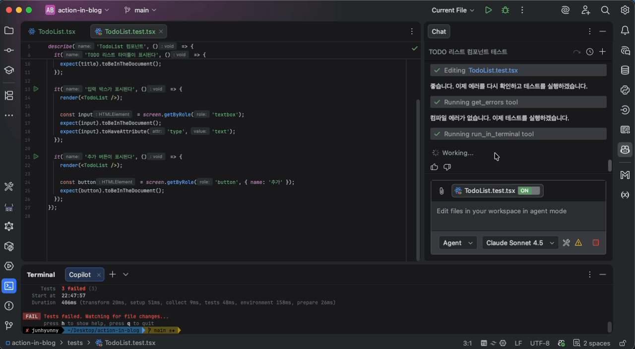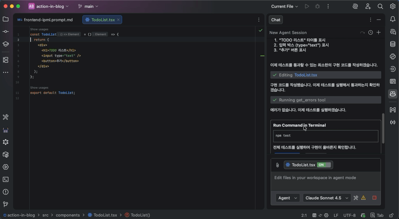 다음은 프론트엔드 테스트를 작성해보자. 다음과 같은 프롬프트를 실행한다. 태스크 생성과 마찬가지로 필요한 MCP 도구를 명시적으로 작성한다.
