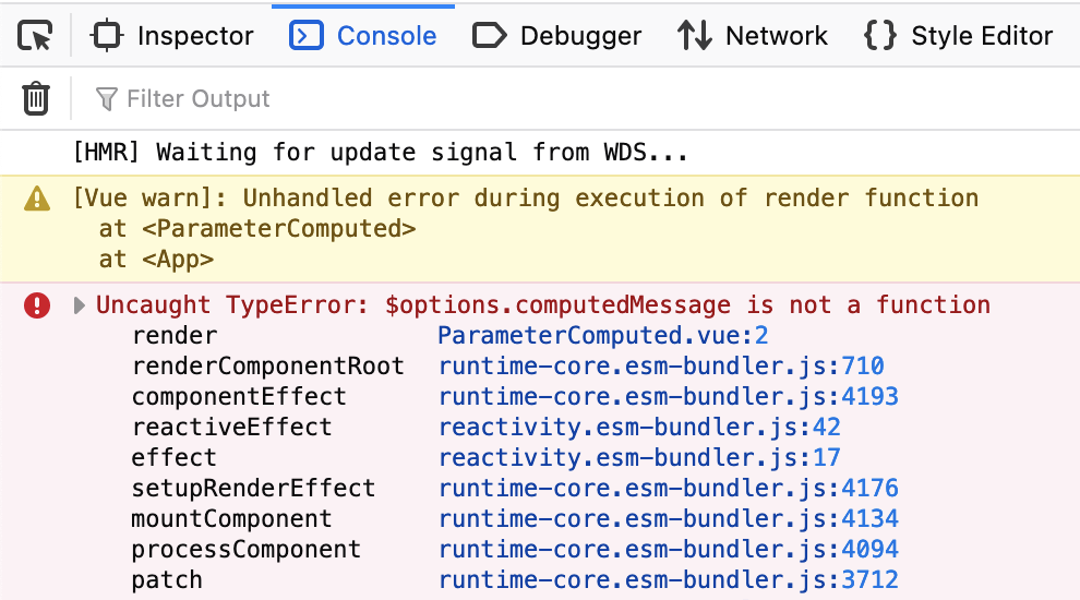 위 코드를 브라우저에서 실행하면 computedMessage는 함수가 아니라는 에러 메시지를 확인할 수 있다.